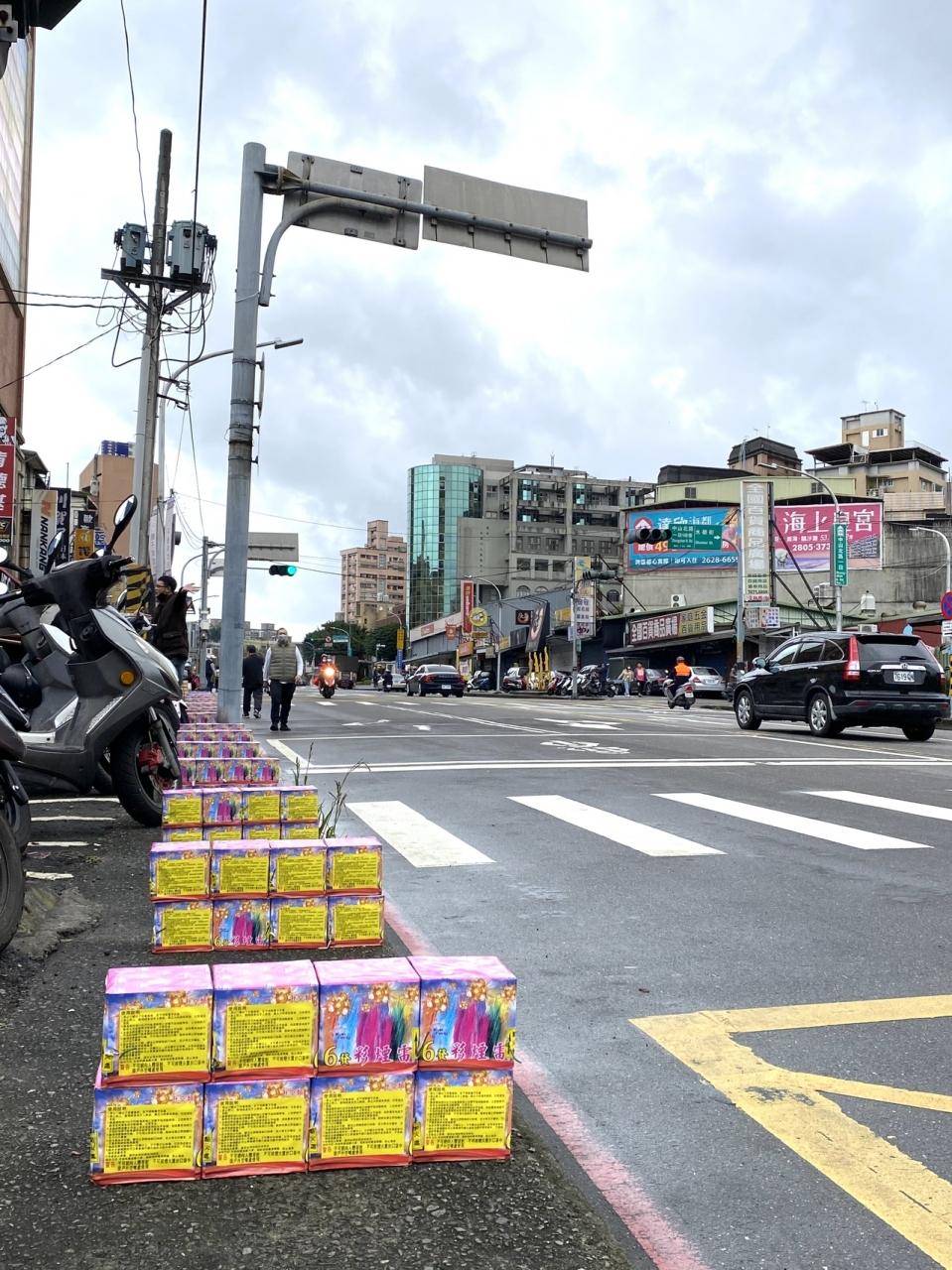 まず向かったのは、淡水中山北路にある祭り行列の出発点。煙が多量に出る花火の箱がたくさん準備されていた。