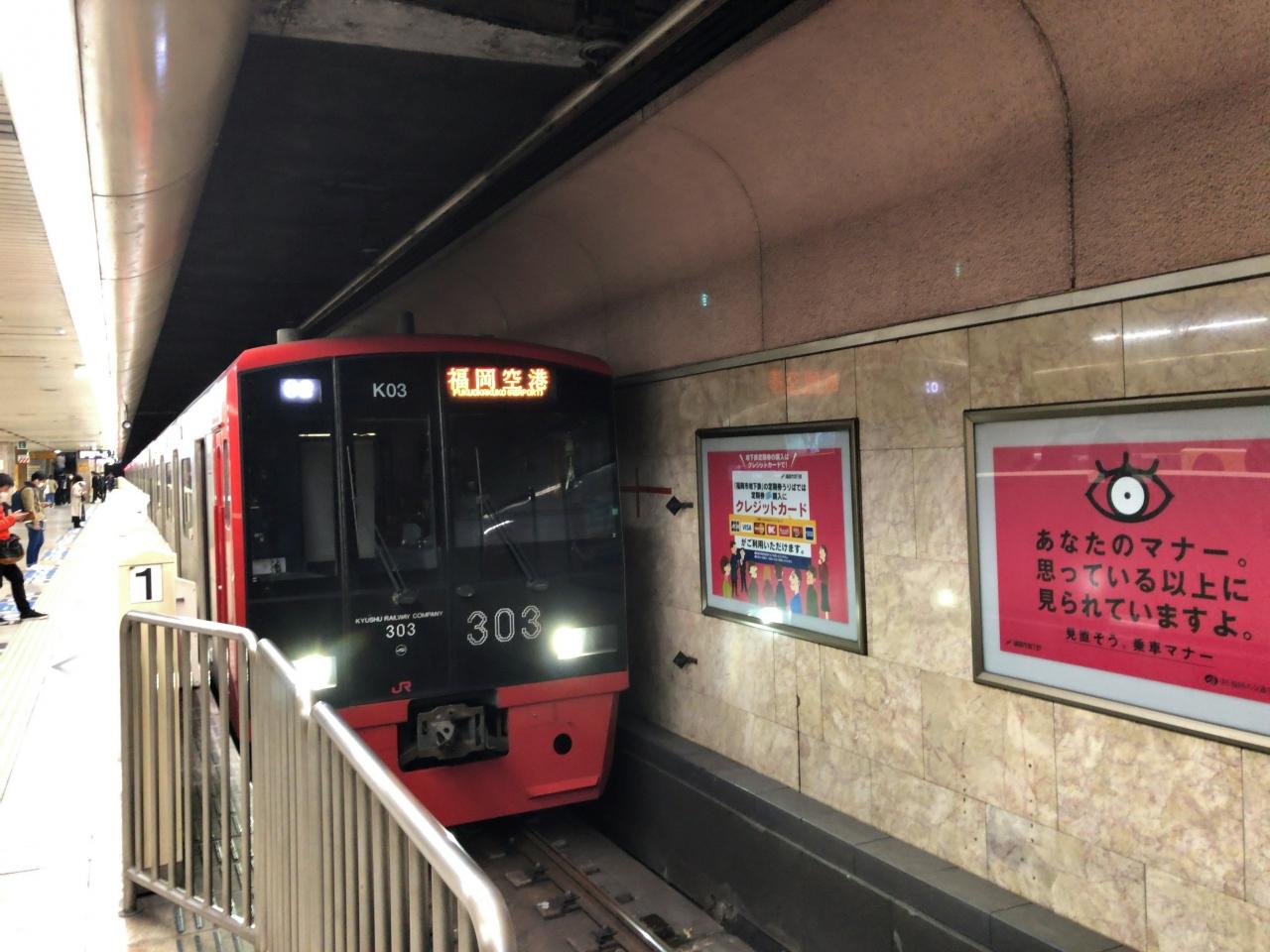 天神南駅から天神駅へ移動して、福岡空港行きに乗り換え、