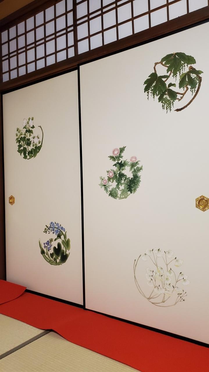 右側の襖絵は、「ギボウシ」「トロロアオイ」かな? -