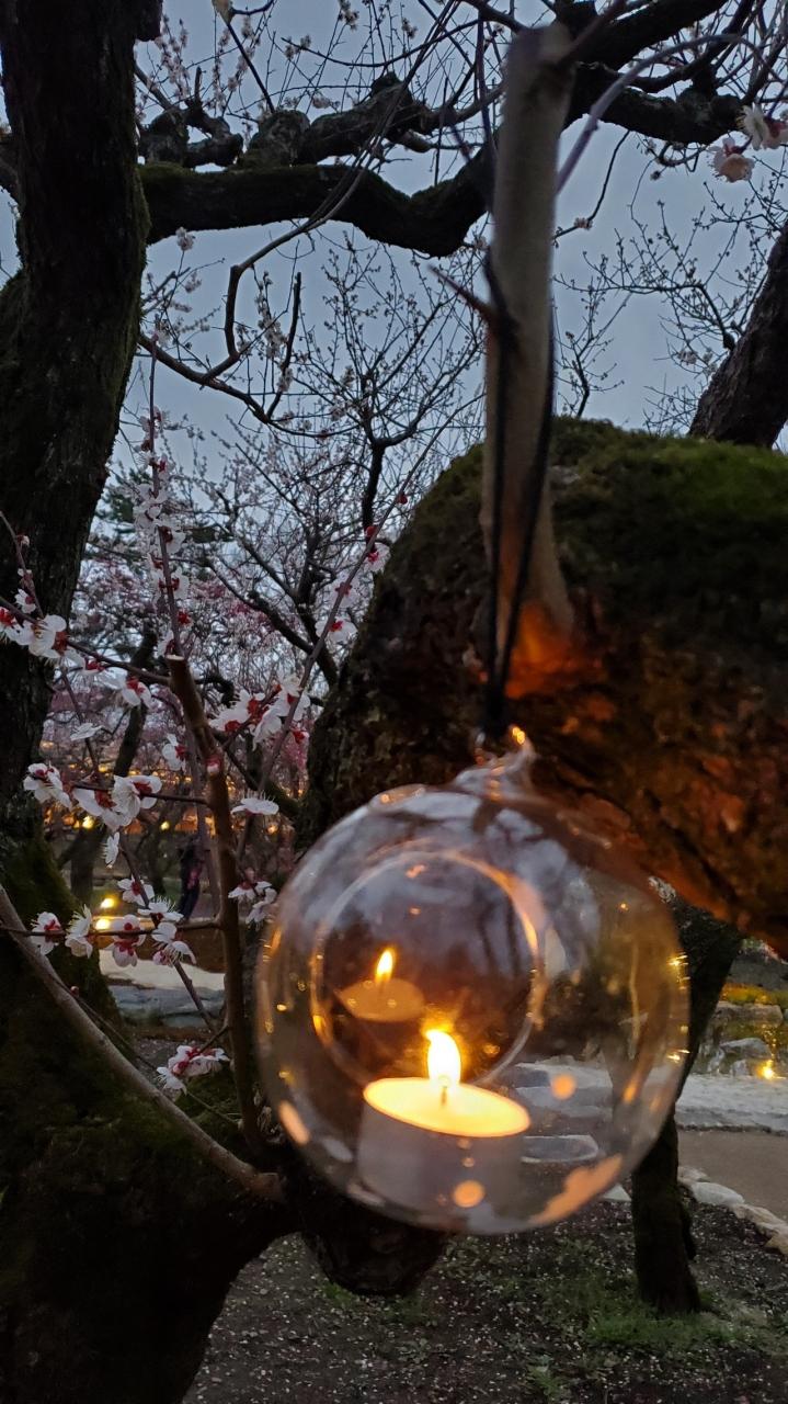 北野天満宮の梅苑では、下からのスポットライトに加えて小さなクリアボールの中にロウソクの灯りが入り、 “丸い灯り” で幻想的な景色を楽しむことができました。