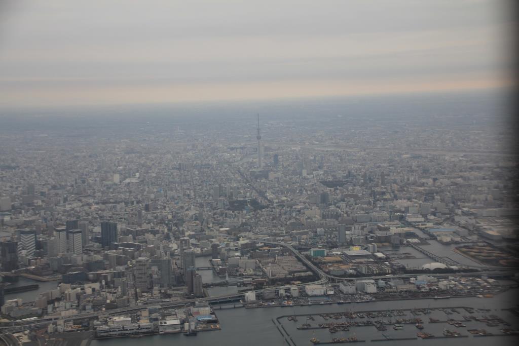 羽田を飛び立つと、東京スカイツリーが見えて、東京の景色がだんだん遠のくと緑の山々が見えてきた。