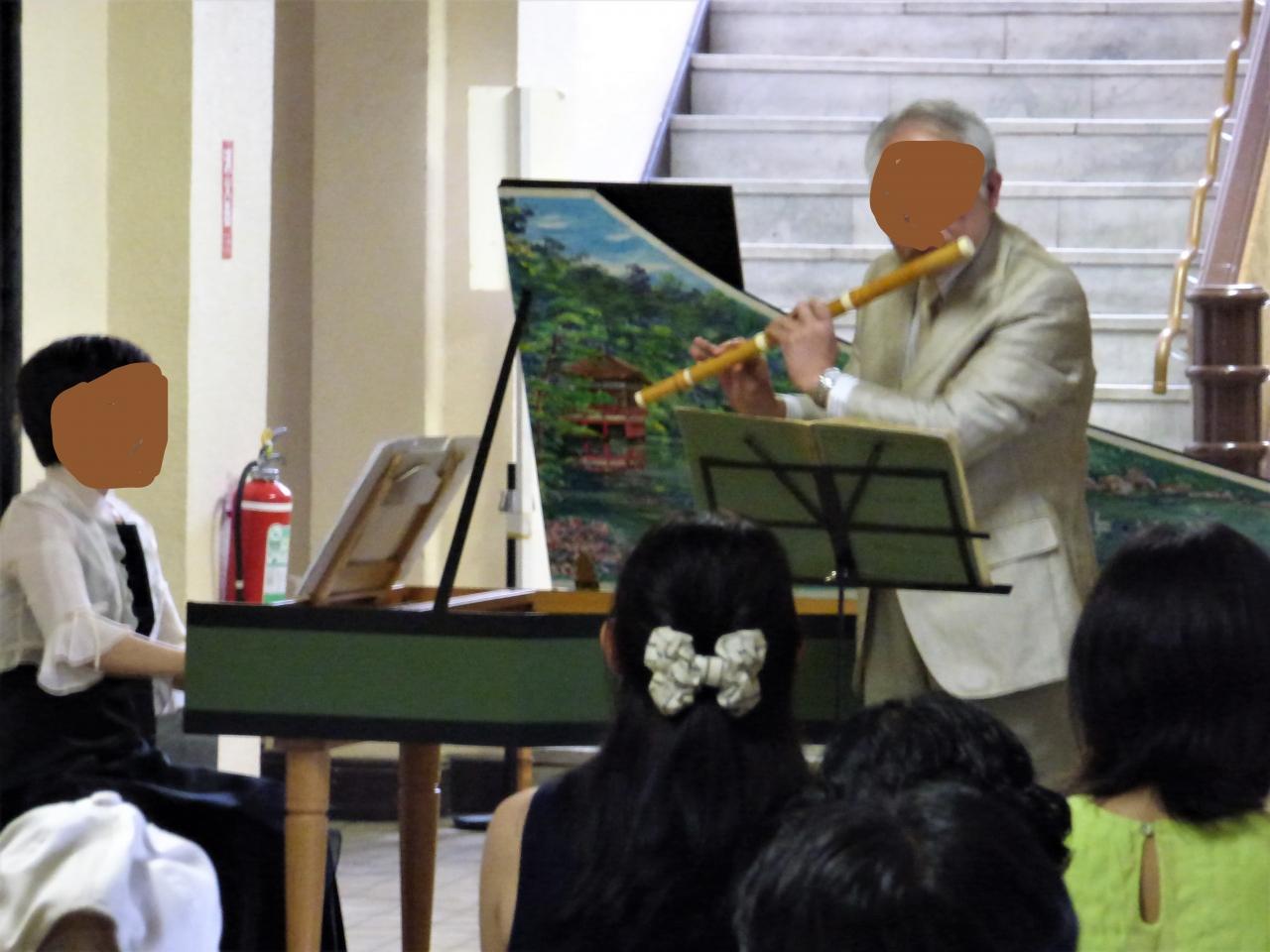 今回は、旅行記に出すのを遠慮してきた私の笛の演奏中の姿を記録したものが多少見つかったので、アンサンブルの仲間には申し訳ないが、顔を塗りつぶしたものを出さしていただいた。私自身の実名情報を一切出さないで、このフォートラの旅行記は作成してきたので、今さらの方針変更は困難だ。どうかお許しいただきたい。
