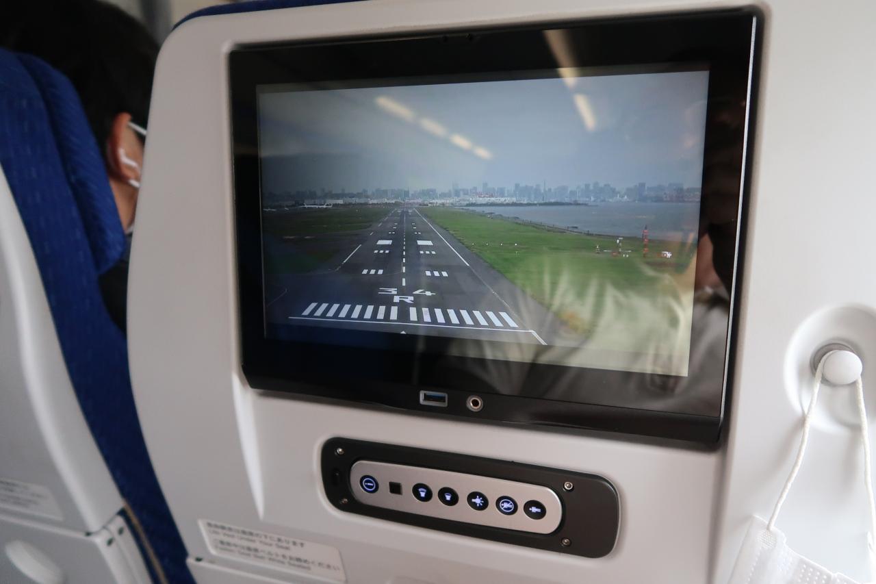 羽田空港はC滑走路に着陸。シートの前に着陸の様子が映し出されたのは、国際線の機体が使われていたためと思われます