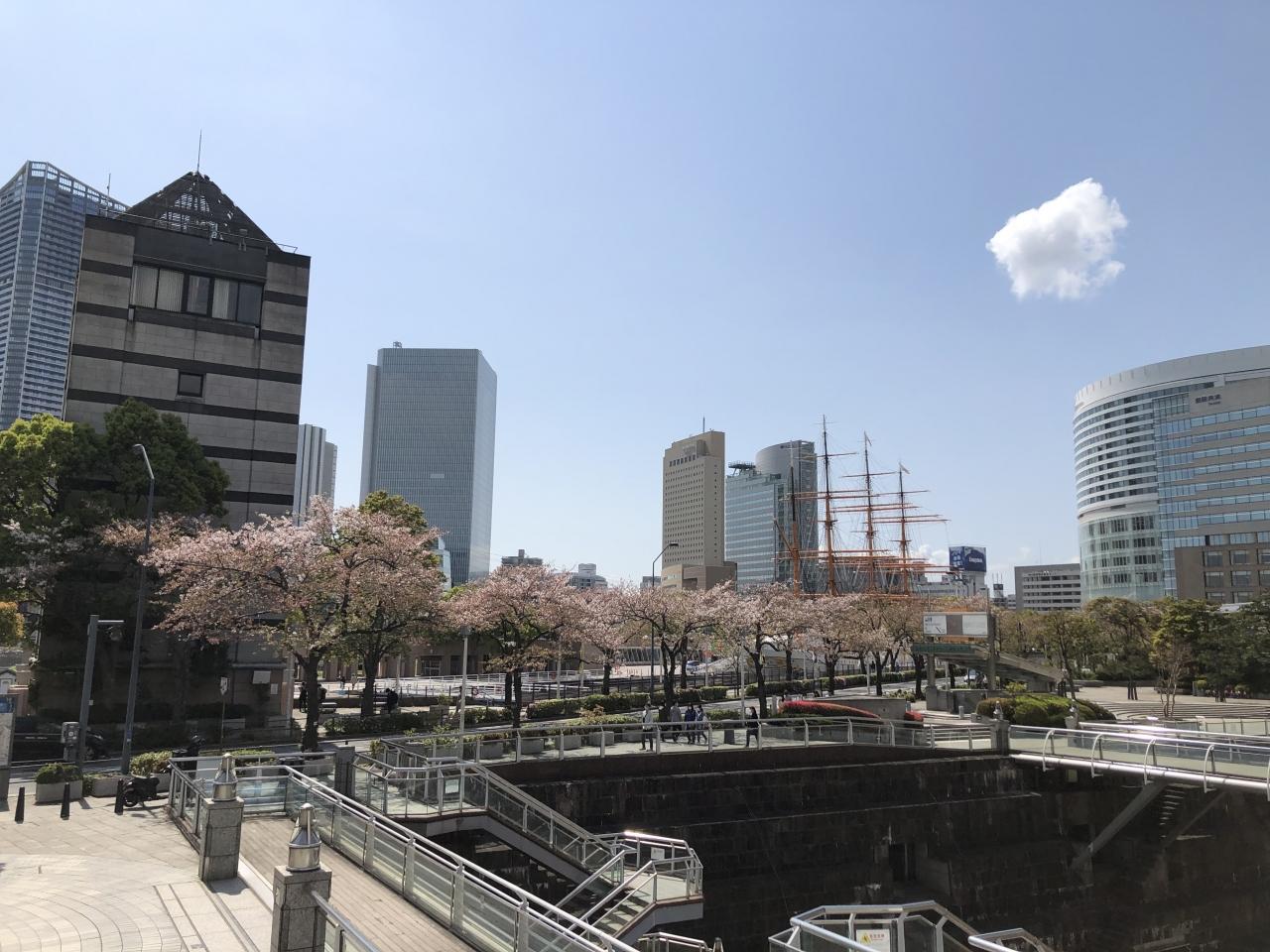 横浜ランドマークタワー前のさくら通り。ソメイヨシノは、だいぶ散ってしまっていました。みなとみらい さくら通り 名所・史跡