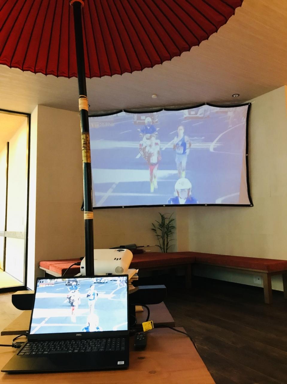 箱根駅伝が始まると、ホテルのロビーでは、プロジェクターが登場。