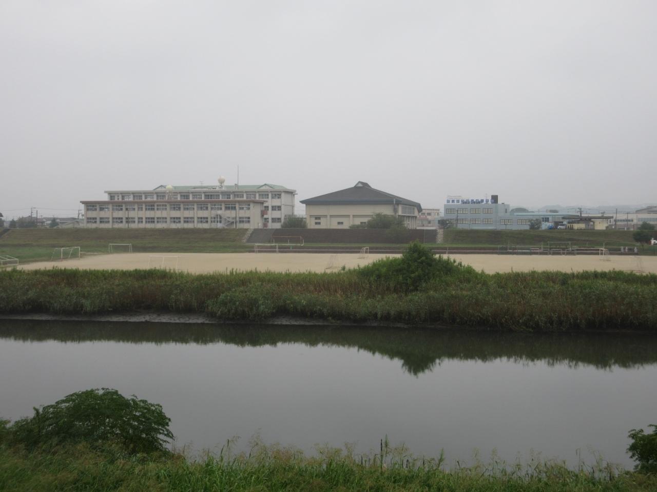 乙津川 鶴崎中学校 左が校舎、真ん中が体育館