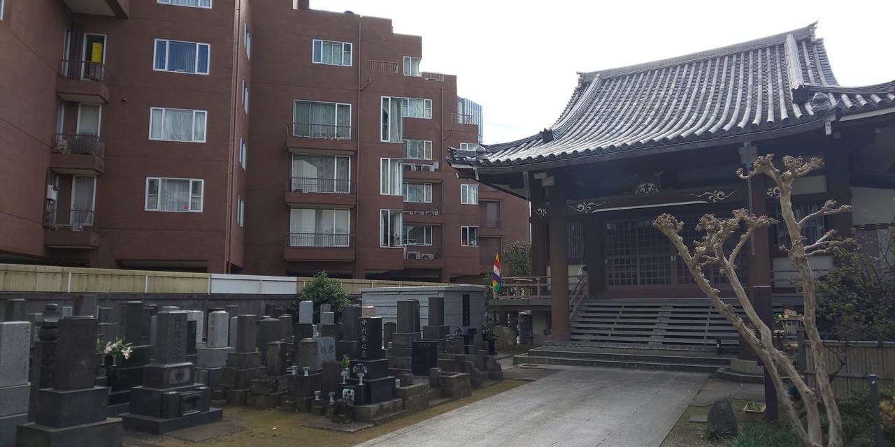 ほぼ駅の近くまで来たところでまた新たなお寺を発見しました。一ツ木通り商店街に面しています。