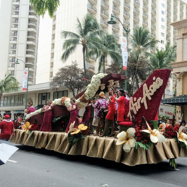 カラカウアAve.で「アロハ・フェスティバル」のフローラルパレードというもの催されており、エアアジアのフロートに遭遇。