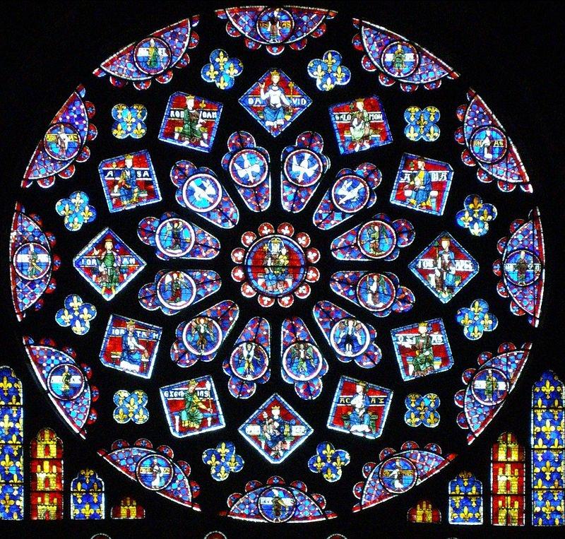 ファサードのバラ窓や、キリストの家系図を表した側廊のステンドグラス「エッサイの根」は、「シャルトルの青」といわれる青みのあるステンドグラスで、13世紀のステンドグラスの極みとして知られる。