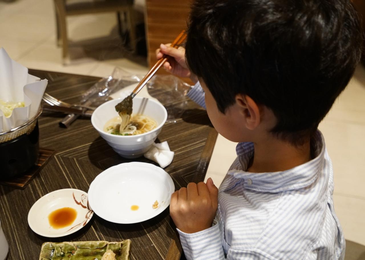 子供たちは麺類を頼みました。カズキは、博多とんこつラーメン。ともちゃんは手延べ五島うどんあごだしスープ。