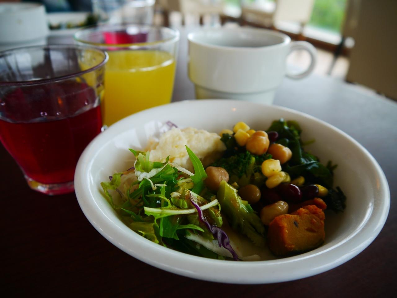 サラダビュッフェにドリンクバーつき、もずくスープ飲み放題。 -