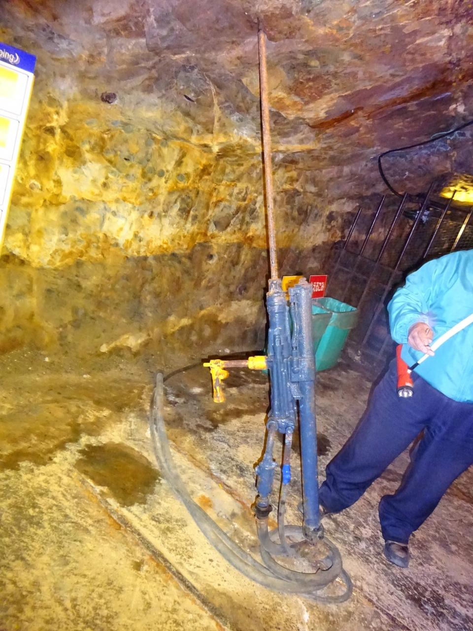 削岩機(穴に火薬を詰め、穴は1.5mで1日2回発破 1日3m掘ります。発破時は一般の人は坑内より出ます。関係者は待避所に入ります。ガスが発生して酸欠が怖い。ダイナマイトは高いので珪藻土とアンモニアを使います。太いのが水(先端部を冷やす。塵肺の元になります。)細いのが空気です。定時の発破は昼間の11:30です。