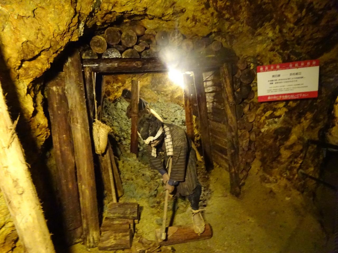 日本3大鉱山の1つ(別子鉱山 阿仁鉱山)。708年に発見され東大寺の大仏鋳造にもここの金が使われ、1062年、安倍氏が統治、平泉の黄金文化にも貢献しました。関ヶ原の戦いの後、落武者が集落を作った。江戸時代は山師や商人が直接経営をし、治外法権の要素があり、手彫りでした。明治時代は岩崎家(三菱)の鉱業権となり、ダイナマイトを使用し、最盛期を迎え1.2万人を数え、1978年閉山となりました。