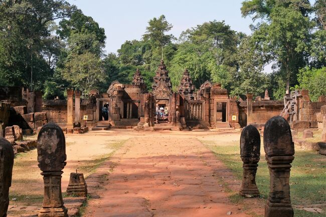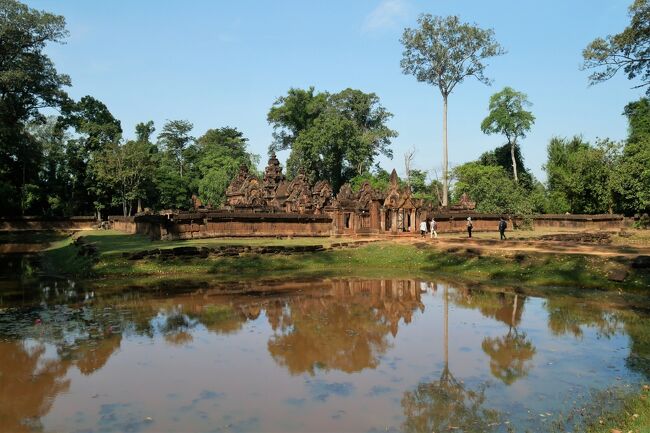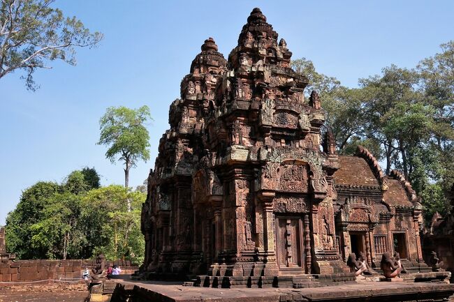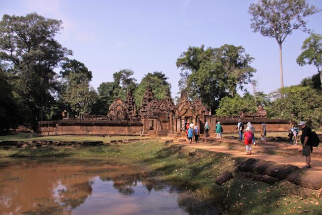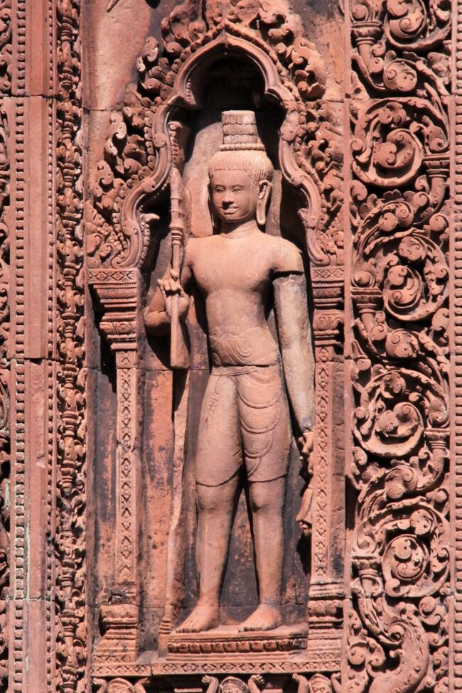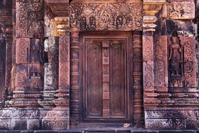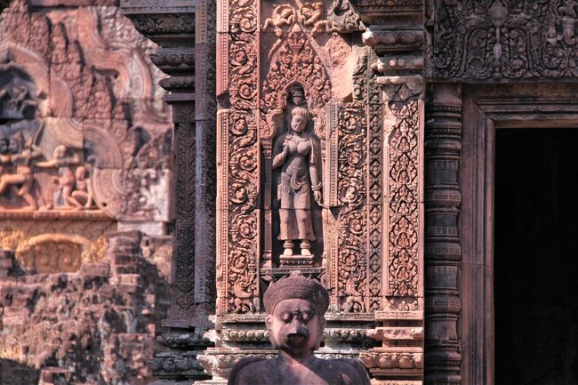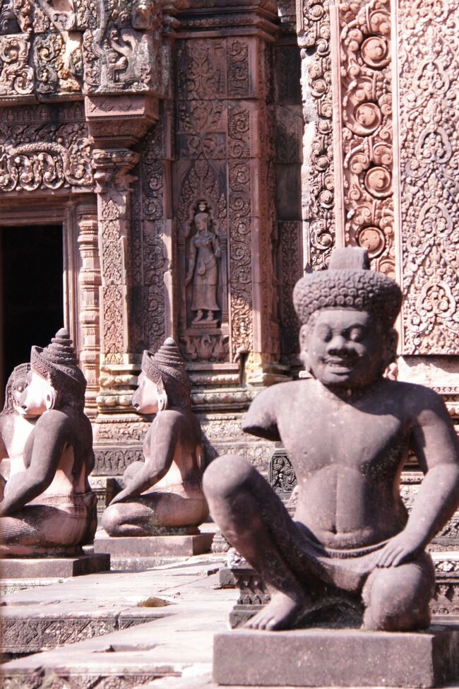 規模こそアンコールワットに及ばないが、赤色砂岩で作られた寺院は周囲に緻密な彫刻が施され全体を覆っている。