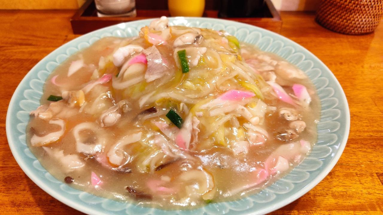 皿うどんは想像よりボリューミー。細い揚麵にたっぷりかかった餡は濃厚で少し甘めの味付け。味に飽きてきたらテーブルのウスターソースや酢を少しかけて味変させていただます。