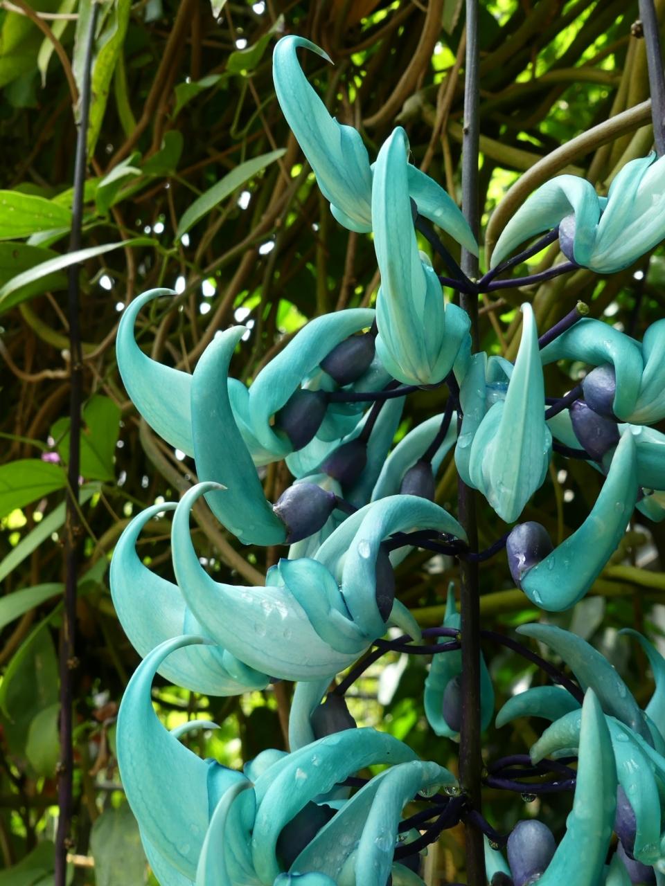 この花は、赤とは違う色で自己主張しています。翡翠のような青緑色の「ヒスイカズラ」です。