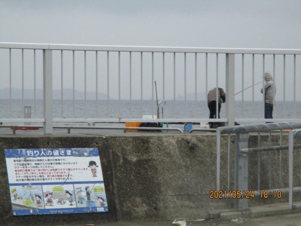 210524-1810.月曜。皆さん引き揚げて、いま桟橋にはこの方たちだけになりました。せっかくの夕方、まだ明るいのに車の中に居ました。その後弱い雨でも風がないから釣りが出来ます。寒くないですから。