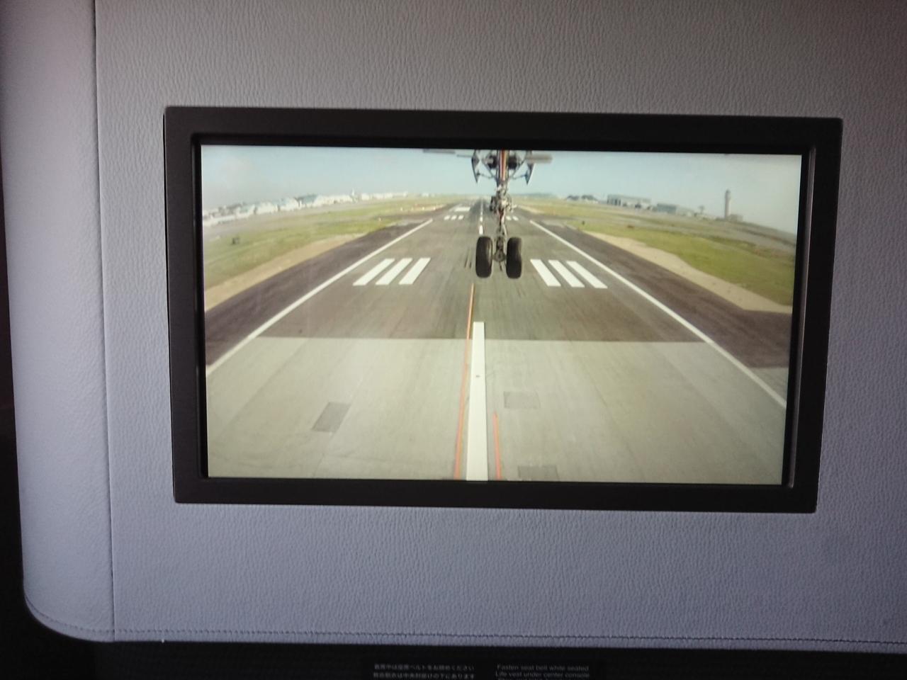 17:10、定刻よりちょっと早く到着。モニターでその瞬間まで見ていられます。クラスJシートでは個人モニターでフライトマップと機外カメラの2種が楽しめるのですが、後日、この機材の普通席に乗った時にはフライトマップだけでした。微妙な差別化?。。。