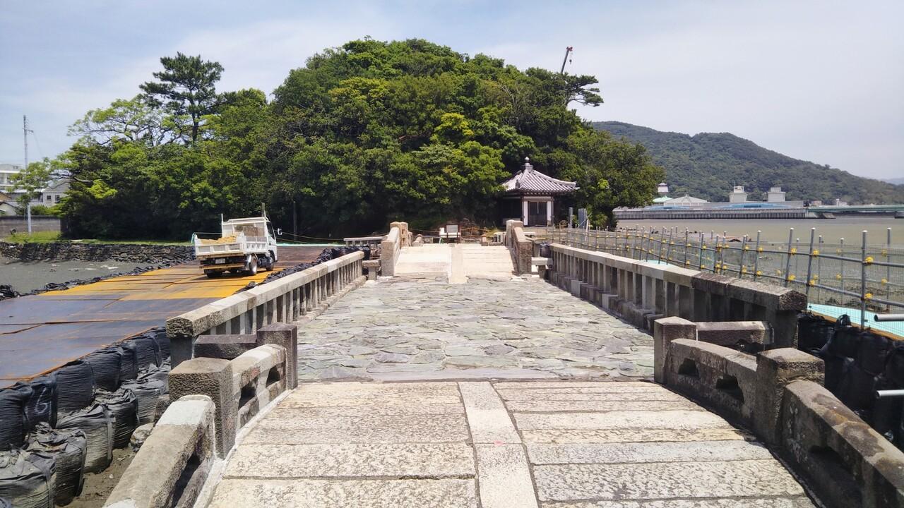 島と陸地を繋ぐ橋は、中国の名橋をモデルに造られた県内最古の石橋・三断橋(三段橋)というらしい。観海閣 名所・史跡