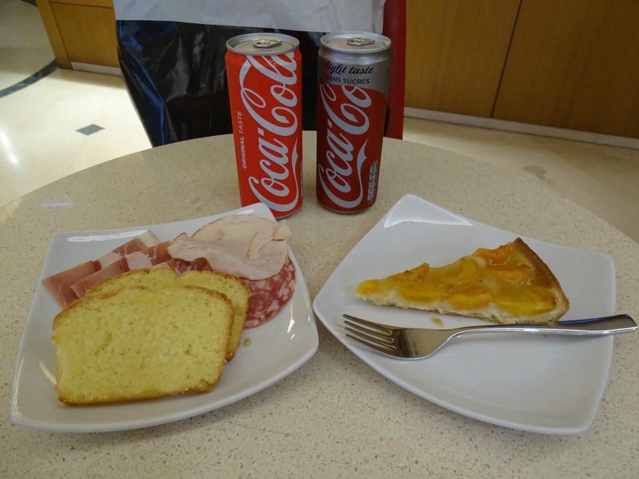 ラウンジではアプリコット・タルト、生ハムを含むハム3種類、ブレッド・ケーキをお皿に乗せ、コーラのレギュラーとダイエットの飲み比べをした。