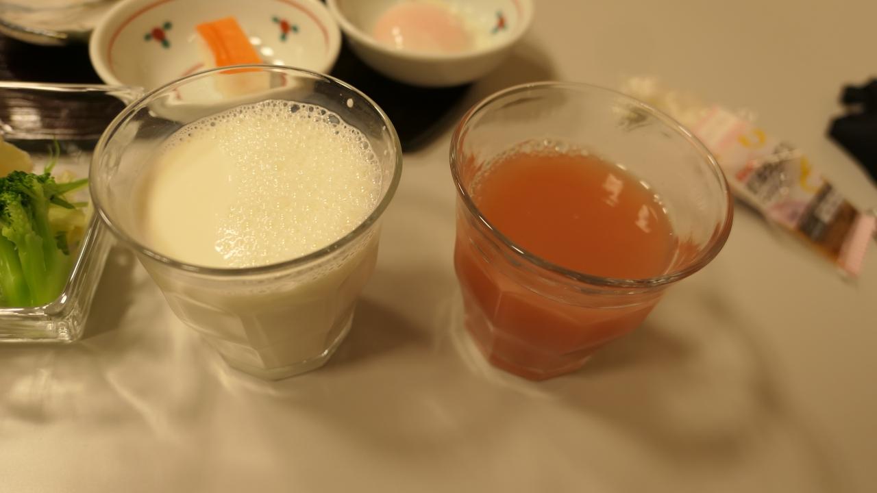 飲み物は牛乳と野菜ジュースです。