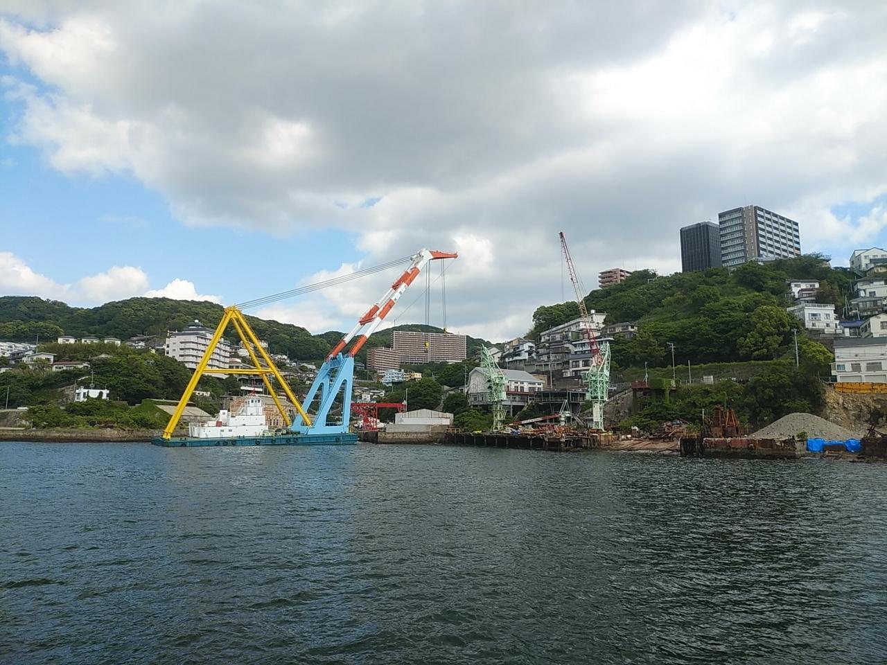 船内アナンスがありませんでしたが、後でGoogleマップを見るとこちら側も三菱重工業長崎造船所があるのですね。反対側にも造船所がありますので、かなり広い造船所なのですね。