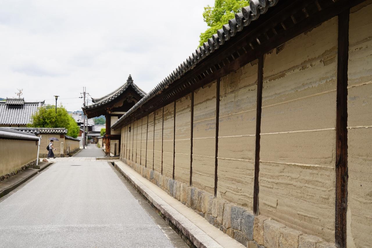 西院伽藍への道。延々と土塀です。