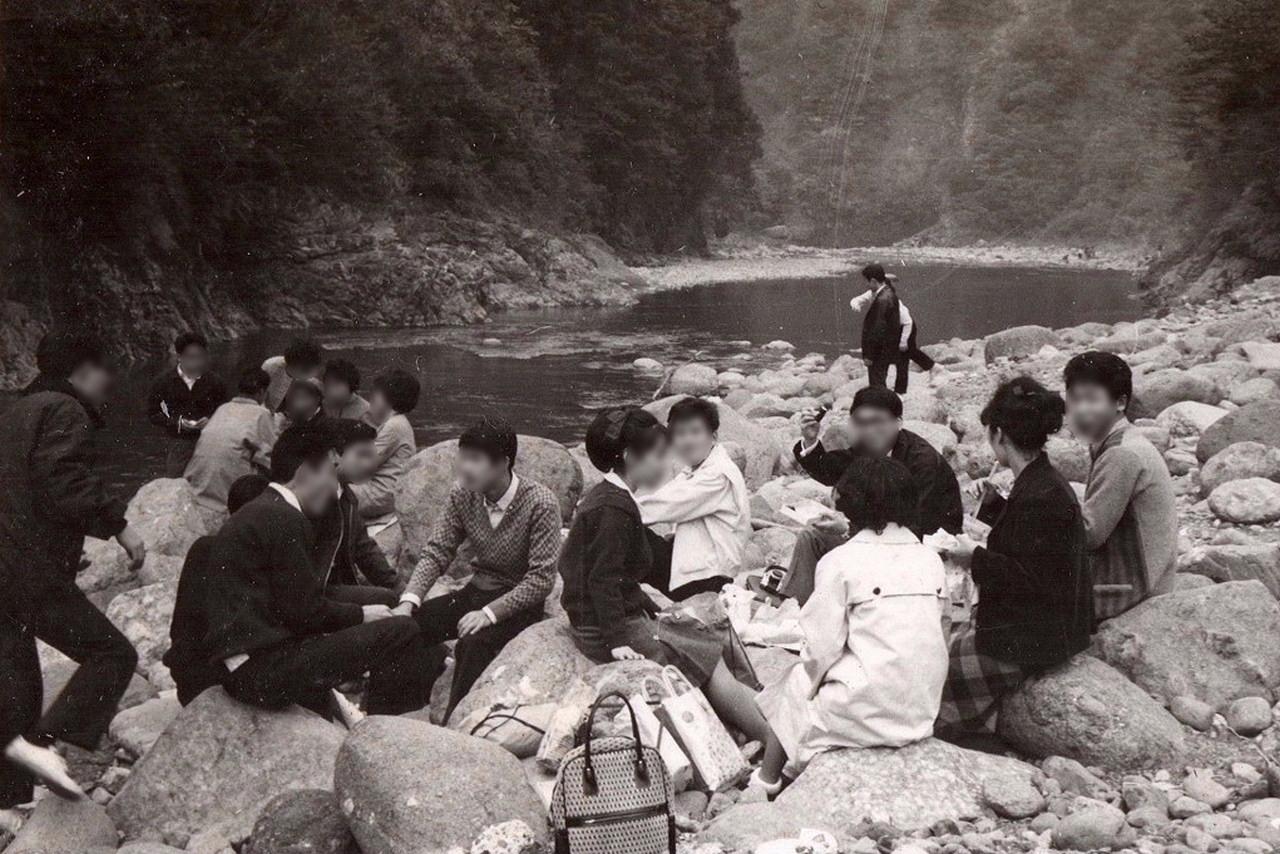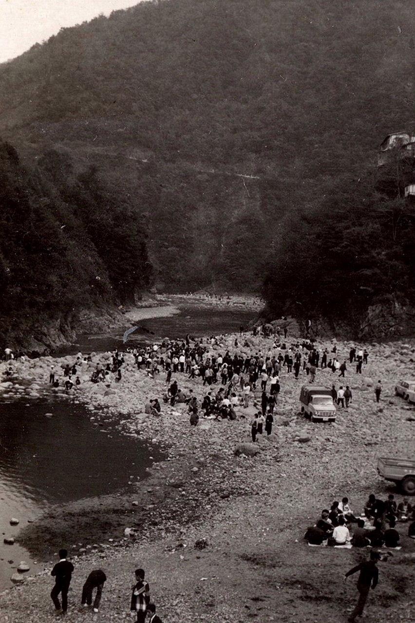 中津峡の河原は、ハイキングで訪れた若者達で賑わっていました。 -