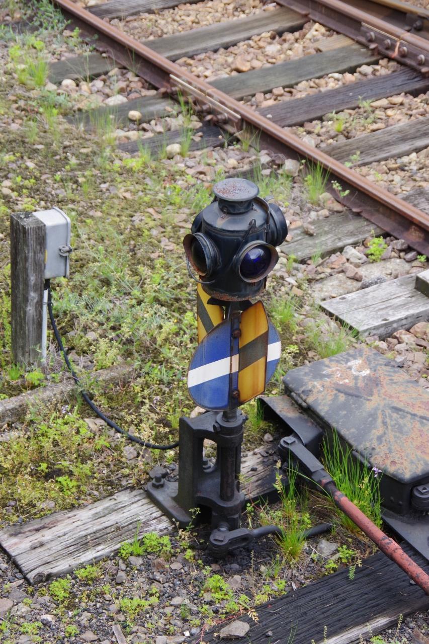 転轍機(てんてつき・ポイント)が切り替わると90度回る標識。