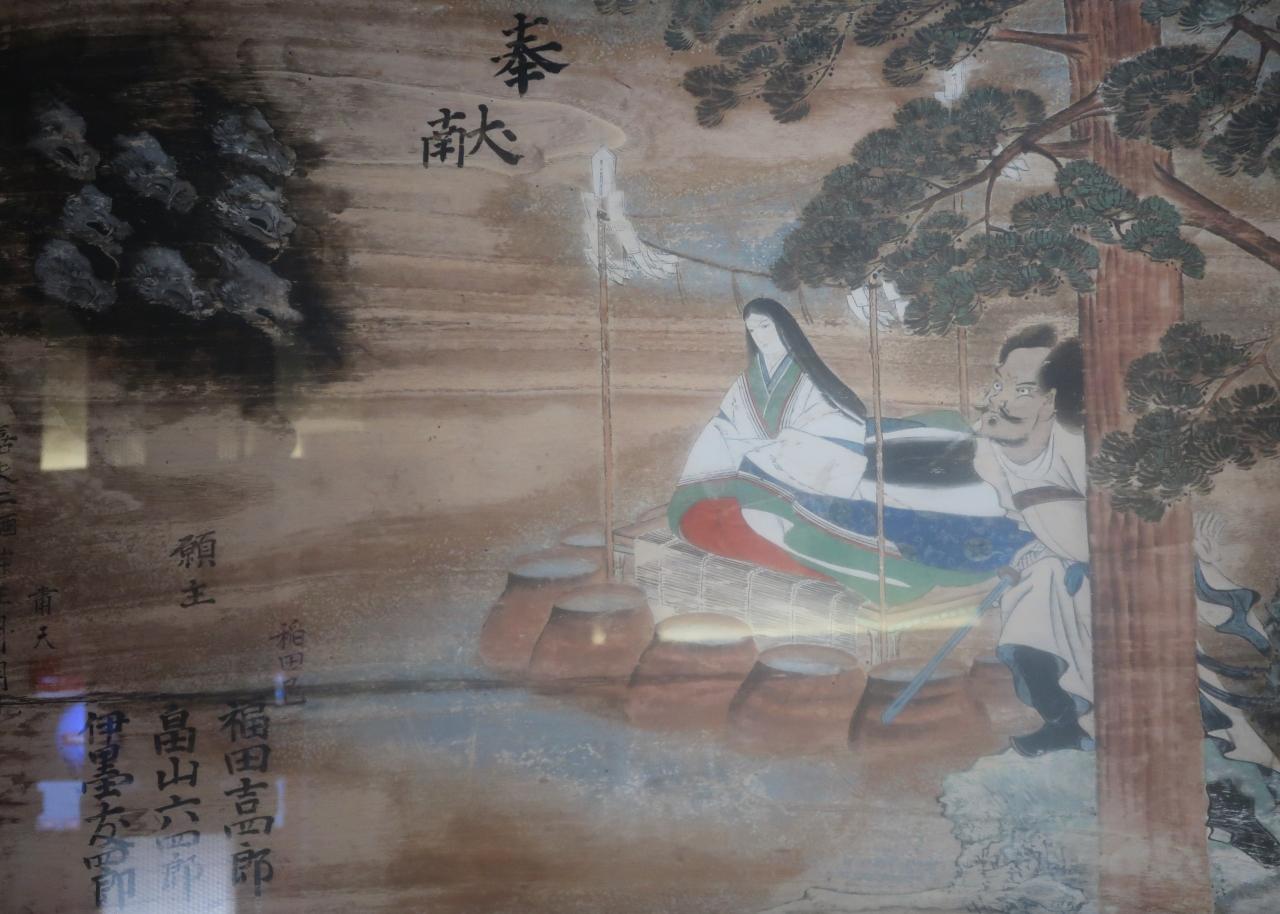 平成12年(2000)、出雲大社拝殿の北側で、3本一組の巨大な柱根「宇豆柱」が発掘されました。直径約1.35mの杉の柱を3本束ねた形状で、鎌倉初期の造営と推定されています。 現在の出雲大社本殿の高さは約24mですが、出雲大社の社伝によると、太古の出雲大社本殿の高さは現在の4倍、約96mあったといわれています。