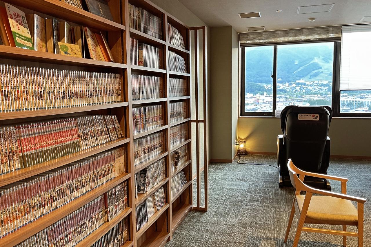 貸切風呂の個室が並ぶ手前に、マッサージ機と漫画が壁面いっぱいに並んだ部屋があるので、混んでいる場合は漫画を読みながら待機出来る。