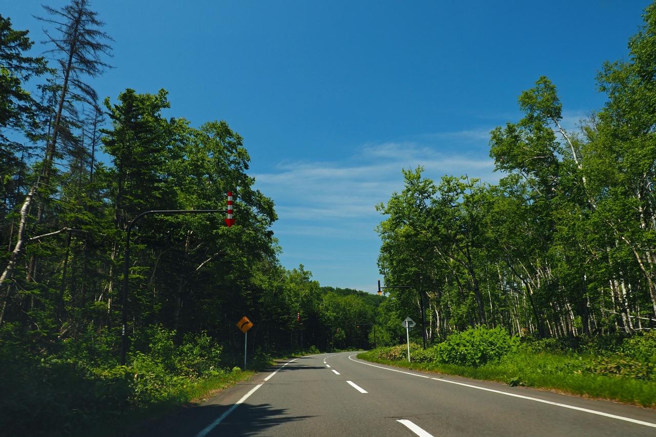 道路を入れて撮影しようとしたら、少し離れた場所に白樺が立ち並んでいて、広い空によく映えていた。
