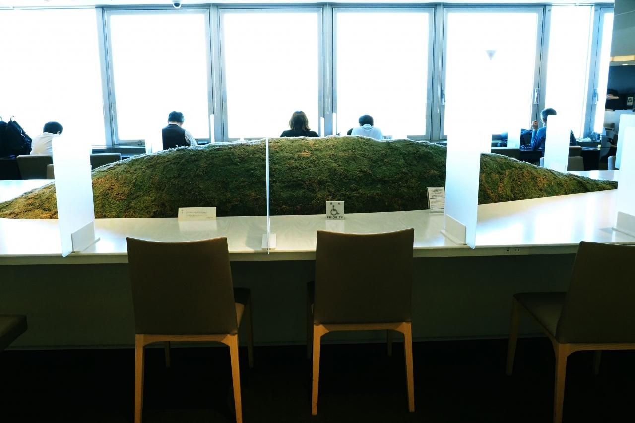 “新千歳空港ANAラウンジ”へ入ると、長テーブルの中央にミニチュア丘陵があって驚いたけど、大窓からは発着する飛行機を見ることが出来た。