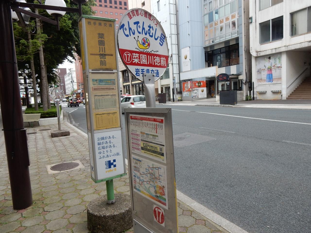 「盛岡城跡公園」から100m位歩いた場所にある盛岡の老舗百貨店「川徳」の前の菜園バス停から、往路でも利用した「でんでんむし号」の「右回り」に乗車してJR盛岡駅に向かいます。