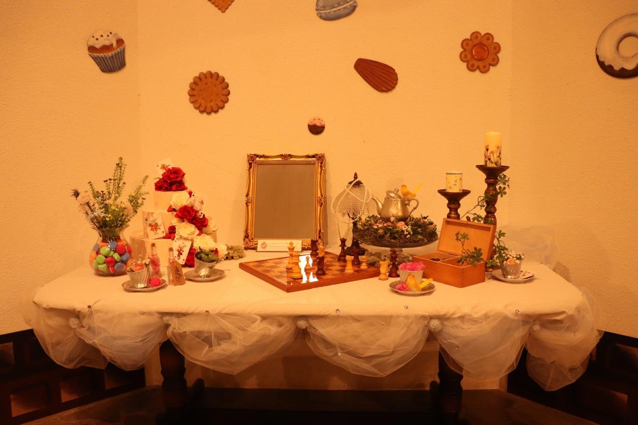 ”鏡の国のアリス” は鏡を通り抜けた先のチェスの世界が舞台となっているので、チェスが飾ってあります。
