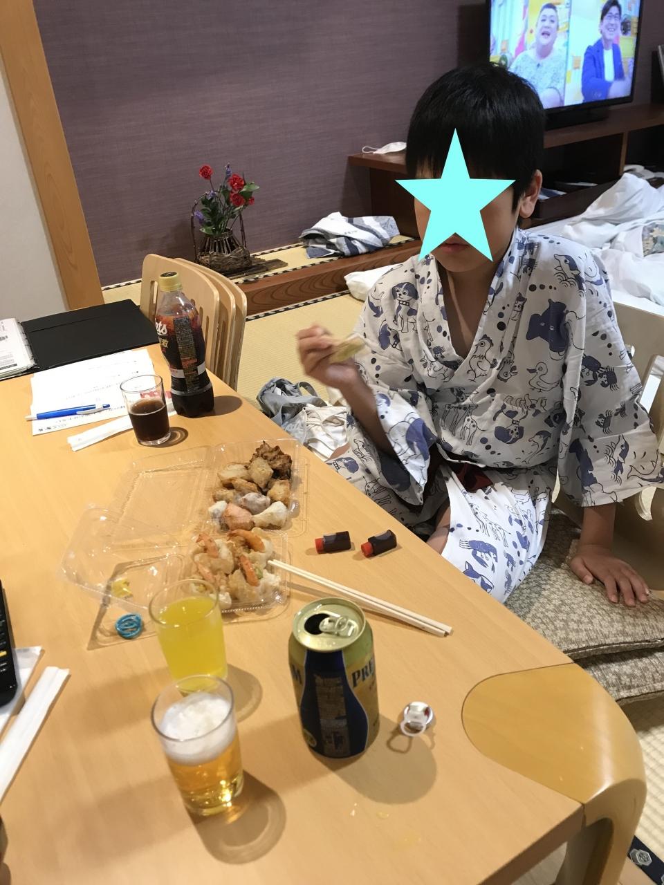 風呂に入って、部屋に戻り、ひろめ市場で買ってきたてんぷらで乾杯!