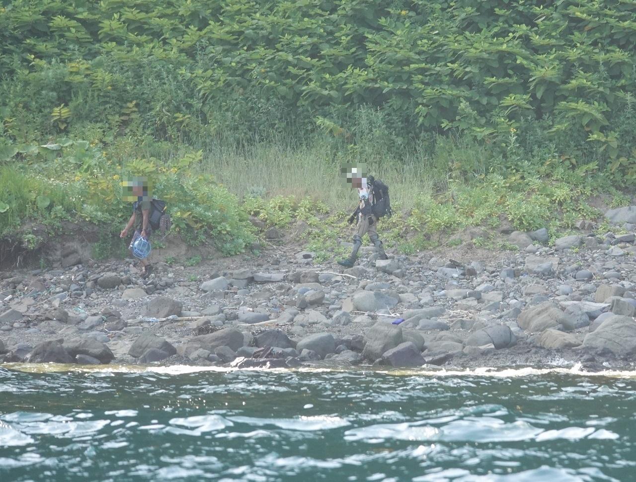海岸を歩く人。一番後ろの人が大きなマイクのようなものを担いでいるので、何かの撮影のようです。なお、人が海岸を歩くと、ヒグマが警戒して出てこなくなります。ヒクマが目当てのクルーズ船客からすると、海岸を歩く人は招かざる客なんですよね。
