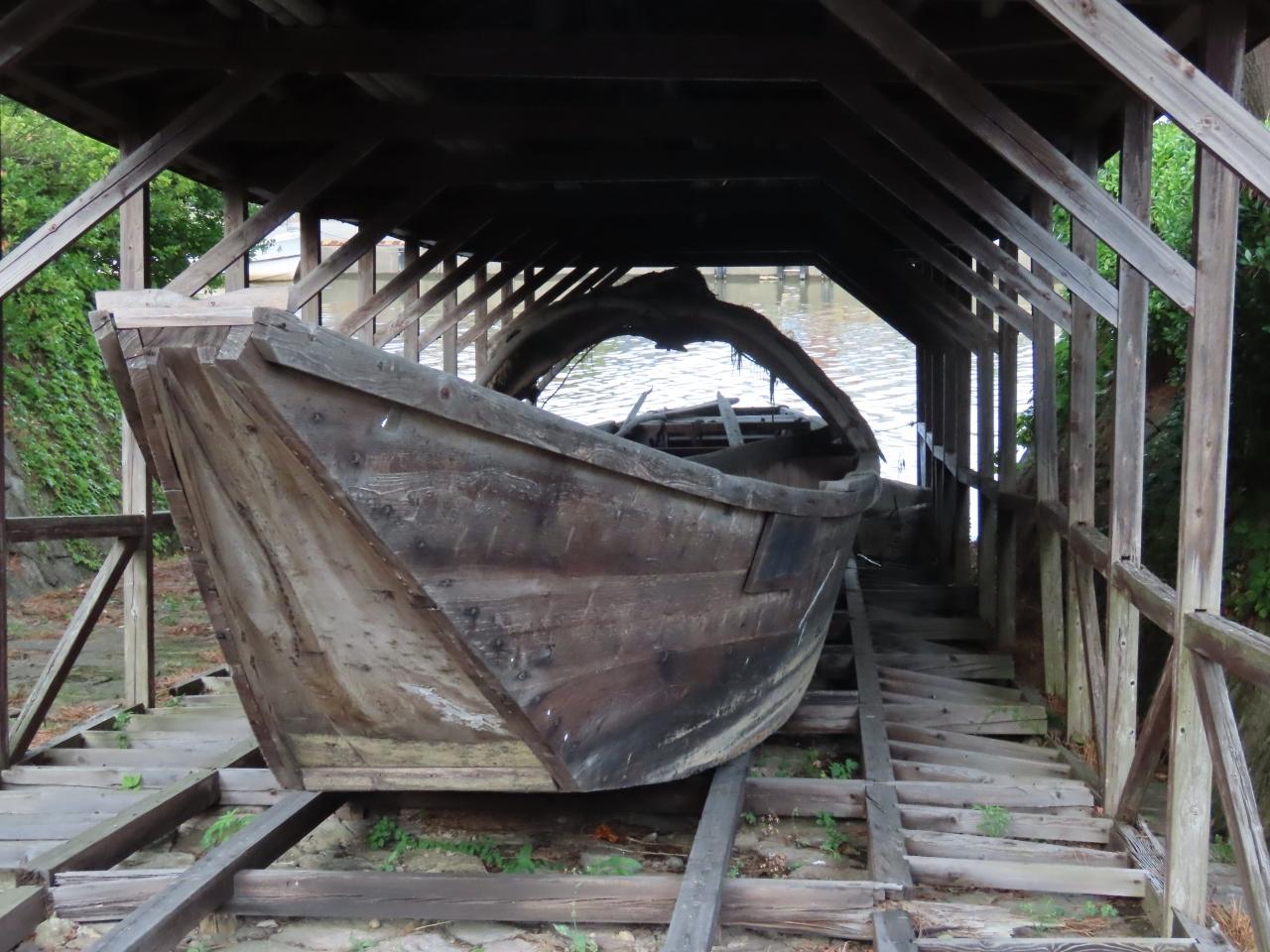 こちらの小鵜飼船。たまたま私たちが船の下に丸太引いて…と、船の降ろし方をイメージして船の前で話していた所、周りの他の観光客の方も船の前に集まってきて、みんなでワイワイと眺めることに。