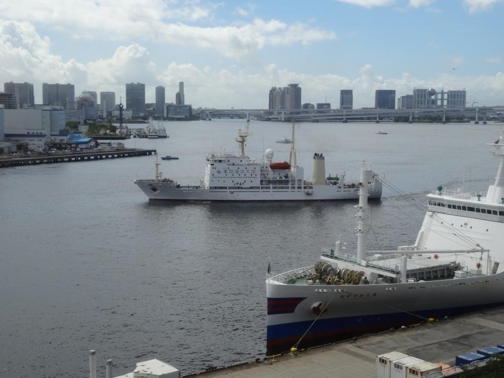 部屋に戻ると、大きな船がやってくるのが見えました。海洋大学の実習船です。大きさだけでなく、種類も様々な船がやってくるので、飽きません。