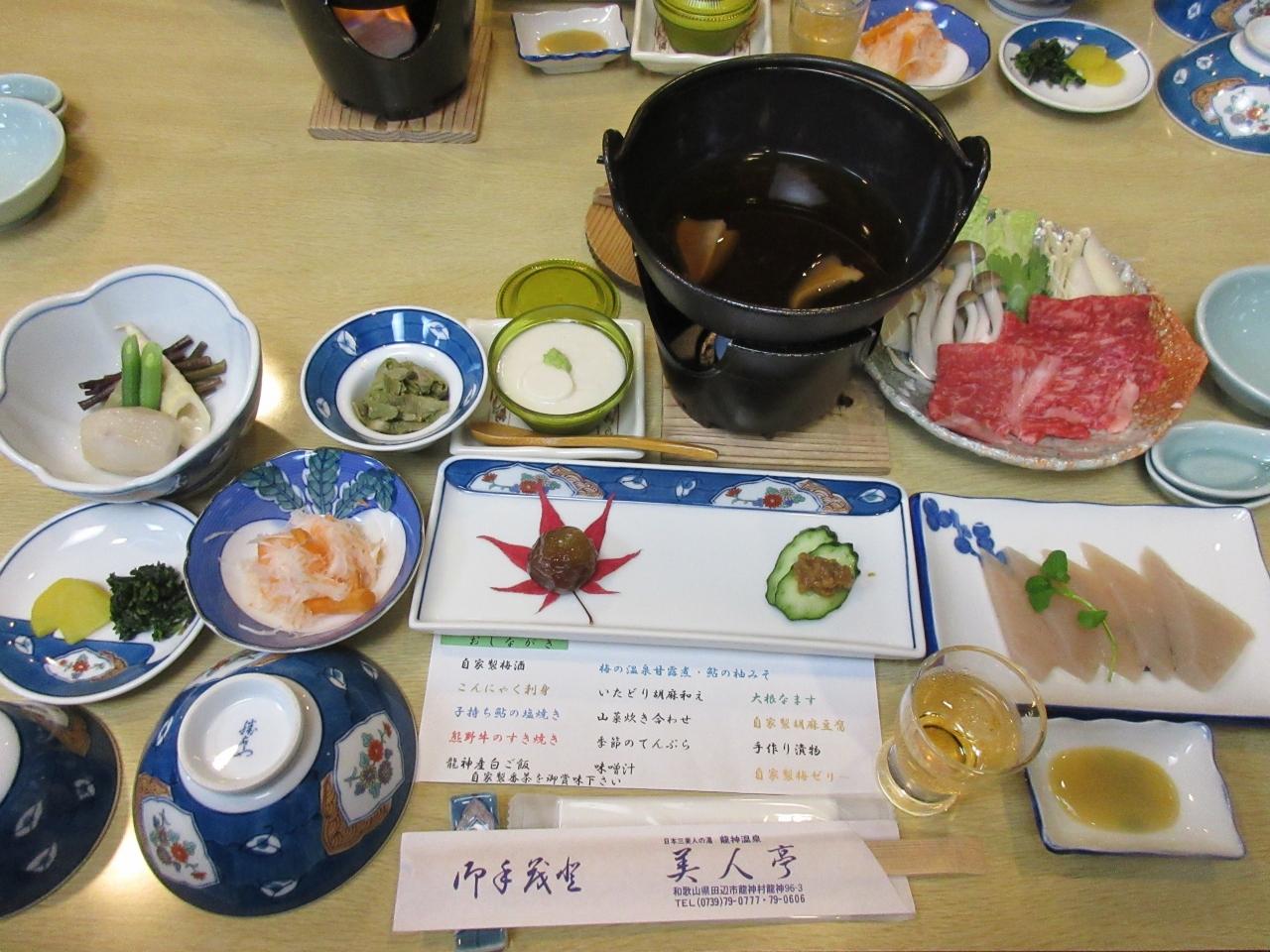 子持ち鮎の塩焼き、熊野牛のすき焼き、山菜炊き合わせ、自家製ごま豆腐、天ぷらなどでした。子持ち鮎の塩焼きと、熊野牛のすき焼きが楽しみで、期待通りに美味しかったです。 -