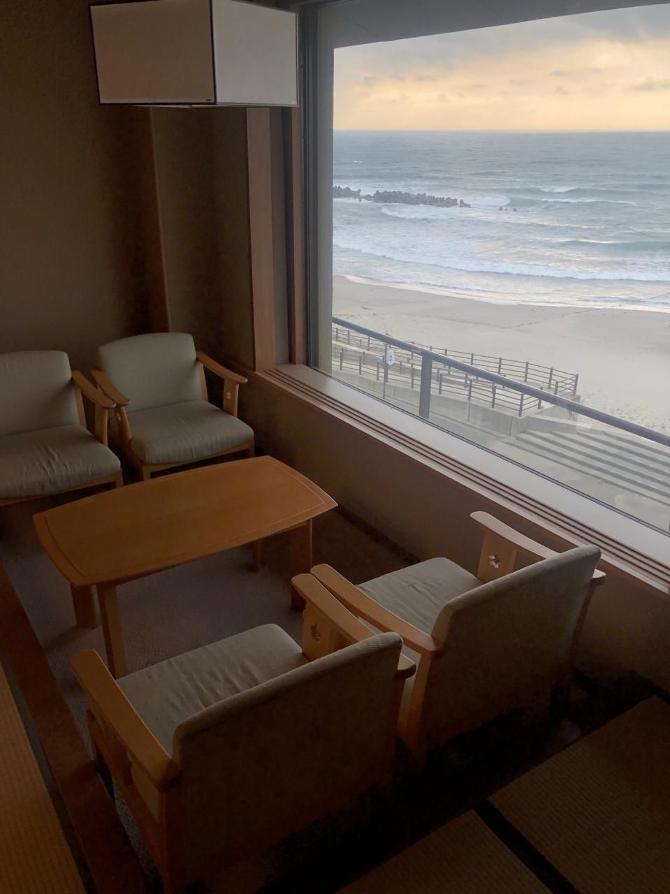 お部屋からは日本海が見渡せるけど、ちょっと曇ってるから夕陽はどうかな?