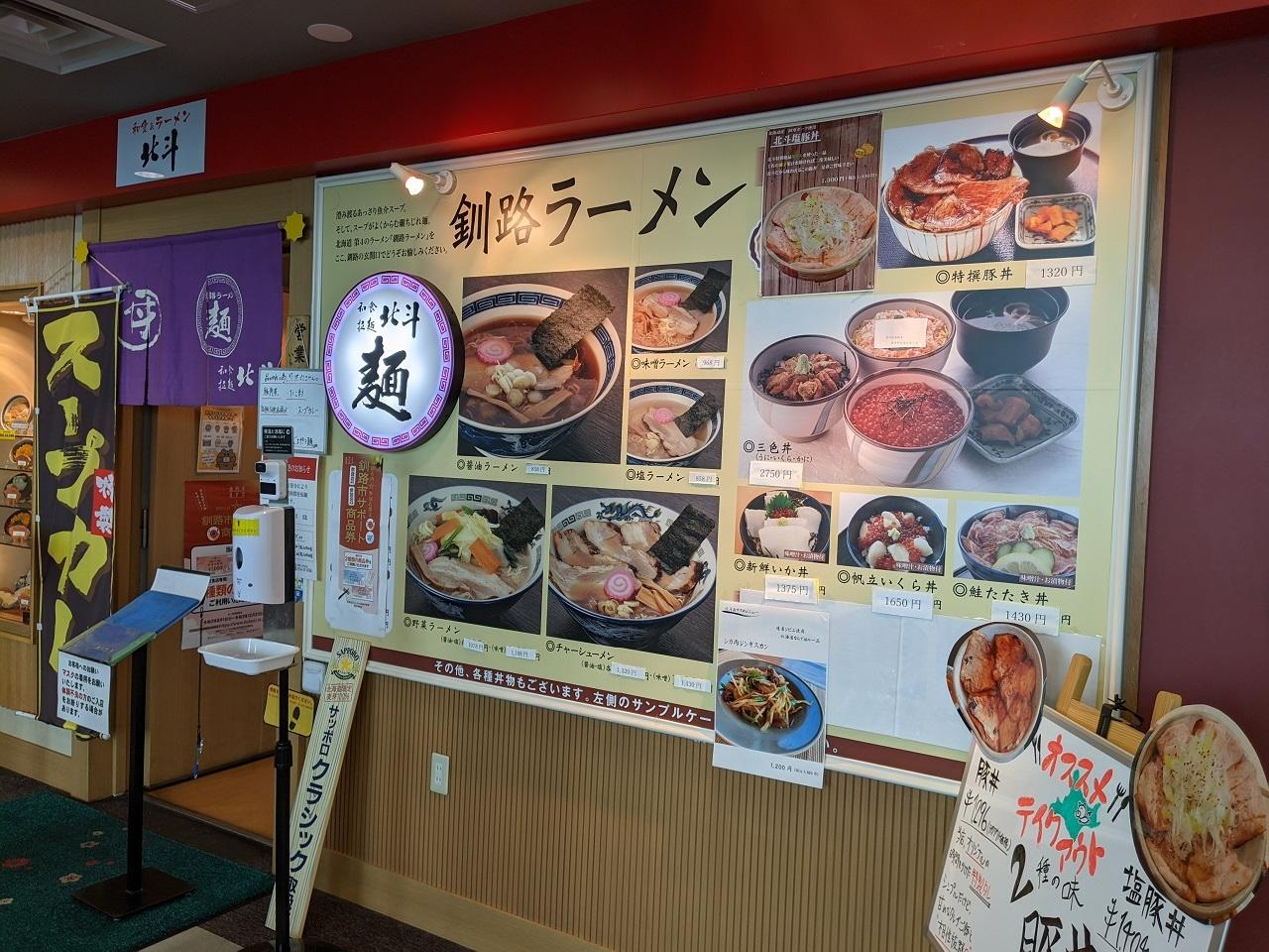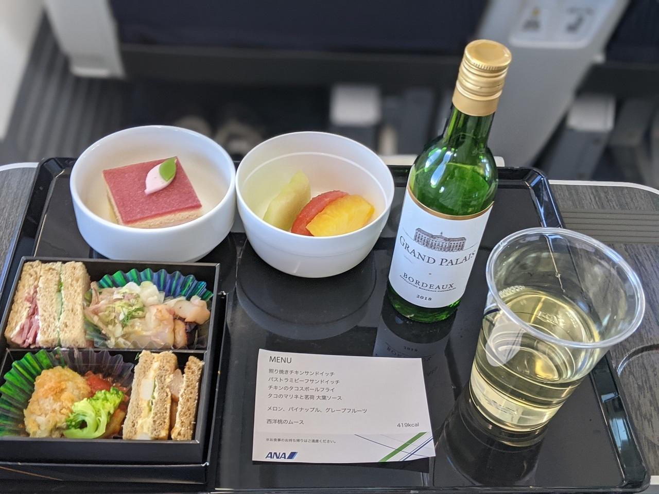 羽田行きのANA便は2日前にプレミアムクラスへアップグレードしたので軽食が出ます。しかしながら、朝食が早かったので機内食の時間まで待てなくて、ラーメンを食べることに。