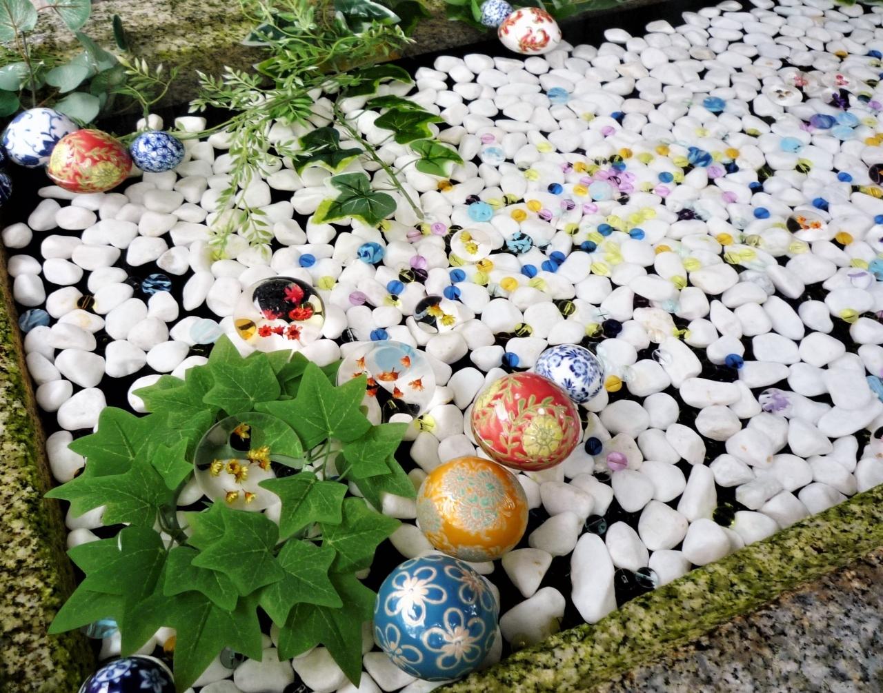 石盤に白石を敷き詰めガラス玉と花玉の花手水で、生花による花手水にはお目に掛かれませんね?。 -