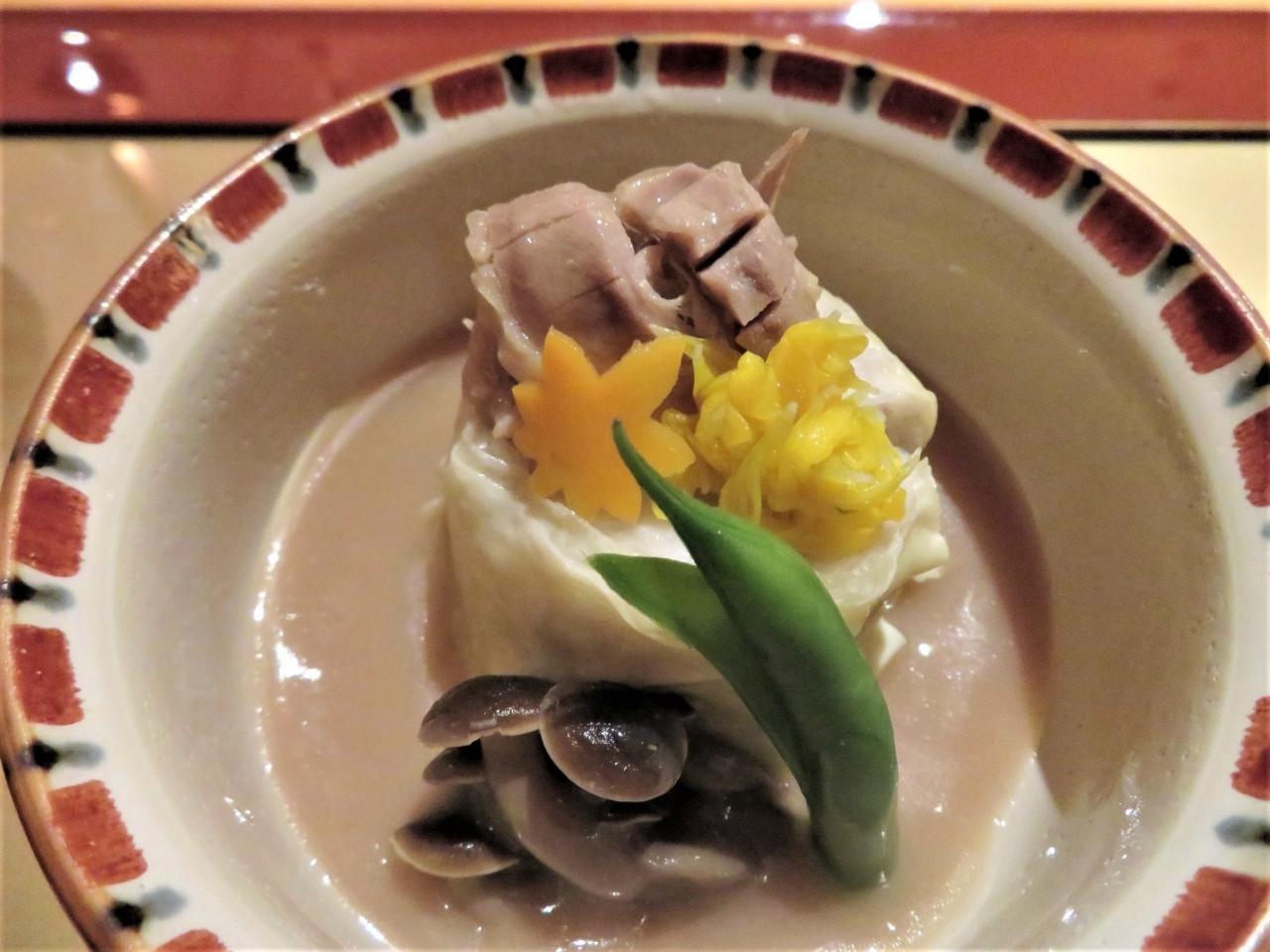 胡桃味噌餡掛け、栃木しゃもオレンジ風味、占地(しめじ)、紅景人参、隠元(いんげん)、菊花。
