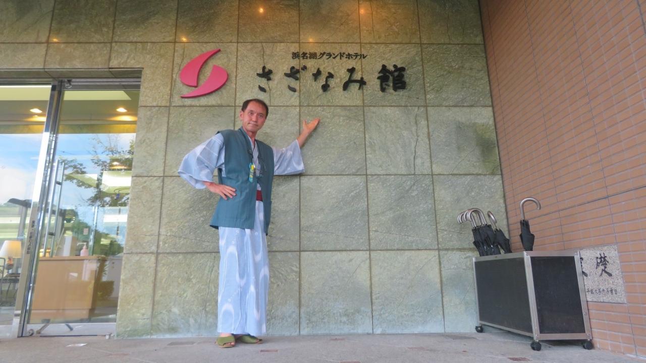 展望台の後は、温泉街の一番奥にある曹洞宗の舘山寺に参拝をしました。こちらの寺院の門前街が、舘山寺温泉に発展したのです。寺院の近くには、湯元が、あります。そして舘山寺の本堂から眺める浜名湖は、とても風光明媚で絵になります。(青空と浜名湖と大草山の緑が、きれいです!)