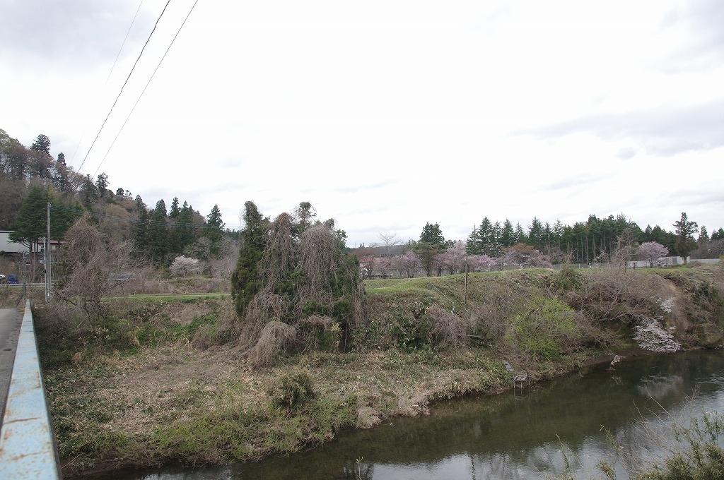 さらに道なりに行き、また衣川を渡ったところが小松館跡(奥州市衣川区横道下)です。5分ほどでした。小松館は安倍貞任の叔父僧良照の館と伝えられ、東は衣川の断崖、西・南は小成沢の崖で囲まれた北から続く大地上に築かれたもので、東西60m・南北160mの規模でした。安倍氏滅亡後は荒廃しましたが、貞治5年(1366)に葛西氏の家臣破石氏が居館を構えました。