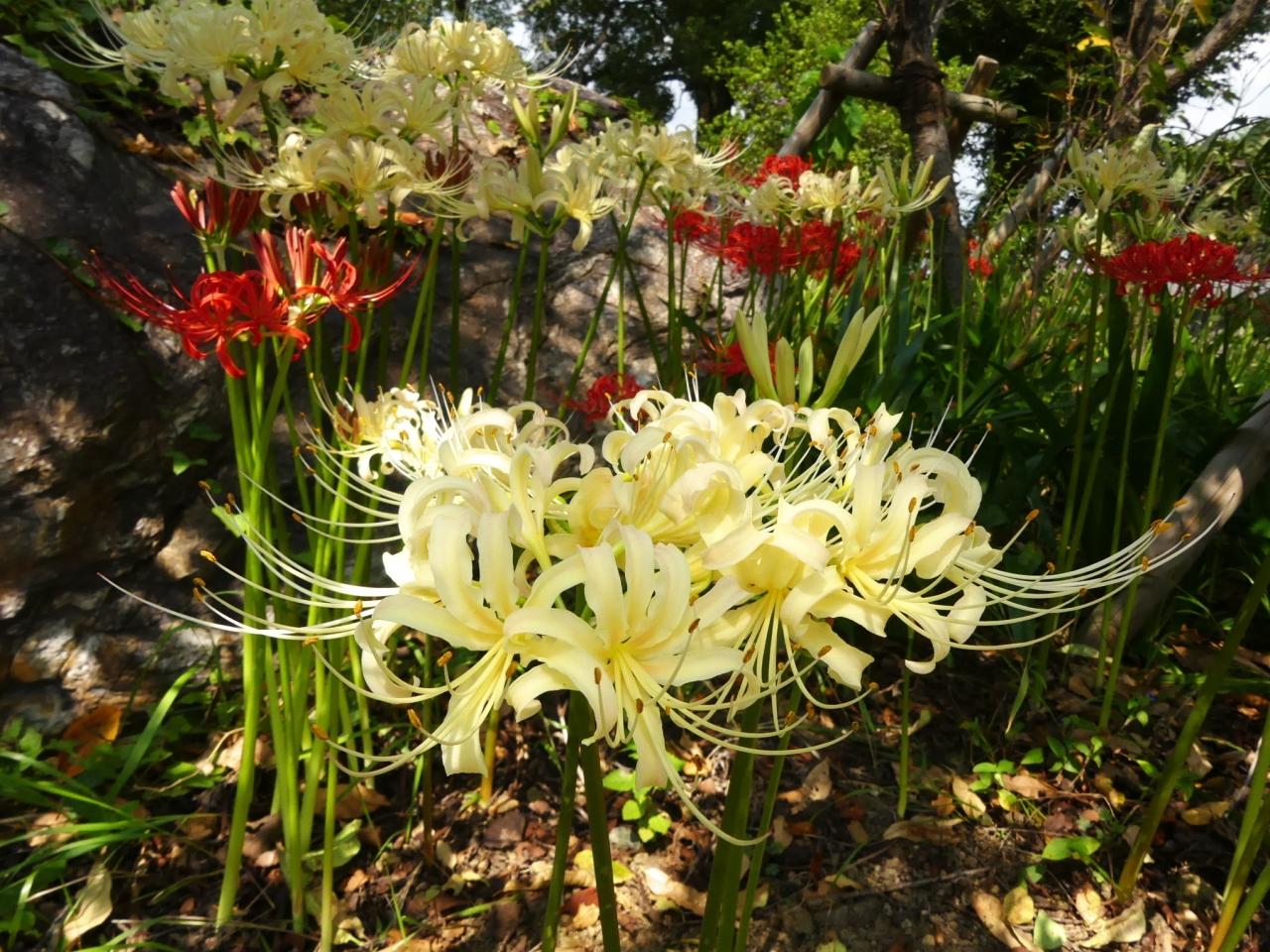 「心池」の東側に藤棚があり、その下にヒガンバナが咲いています。