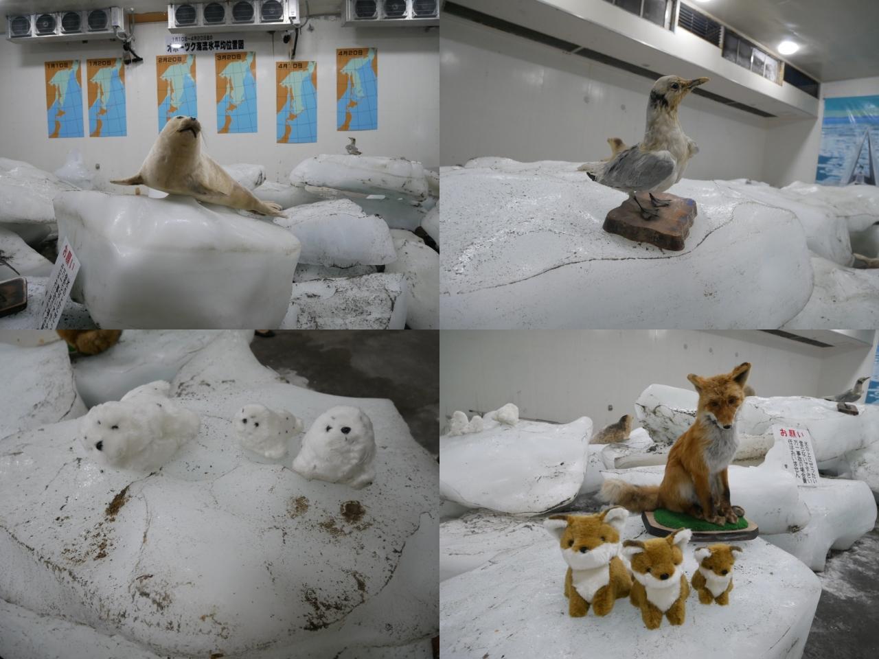 氷と動物のはく製(?)かもしれないものと明らかにぬいぐるみが。