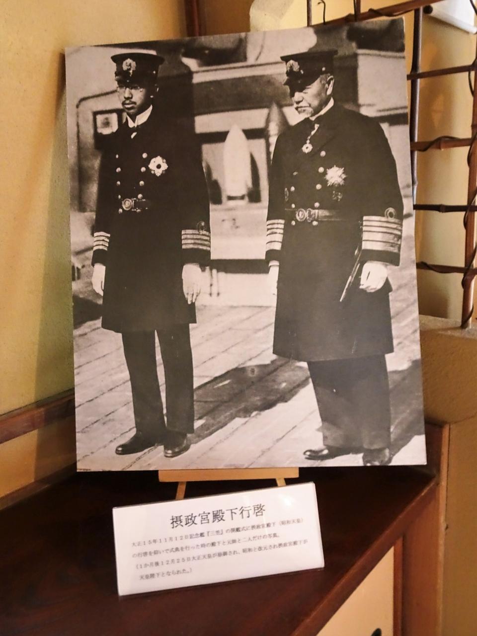 戦艦「三笠」上の東郷元帥と昭和天皇の写真