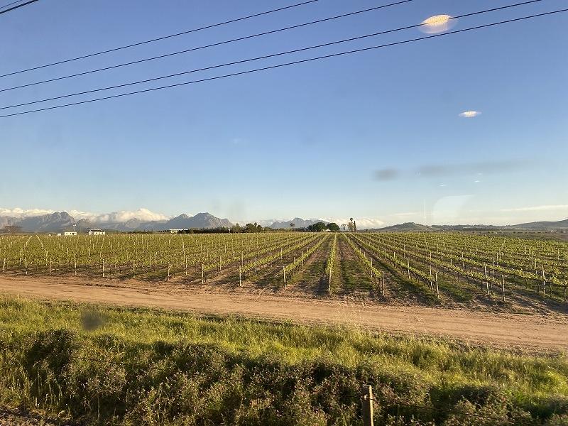 夕焼け色に色づいたぶどう畑が広がるワインランドを通過していく。
